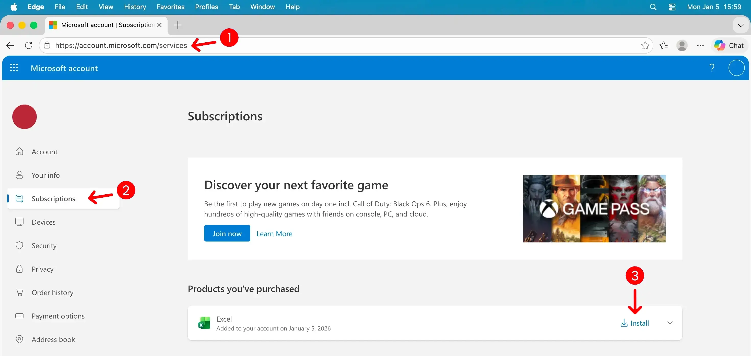 5. Once your product key is redeemed, go to account.microsoft.com/services and click "Install" next to Excel.