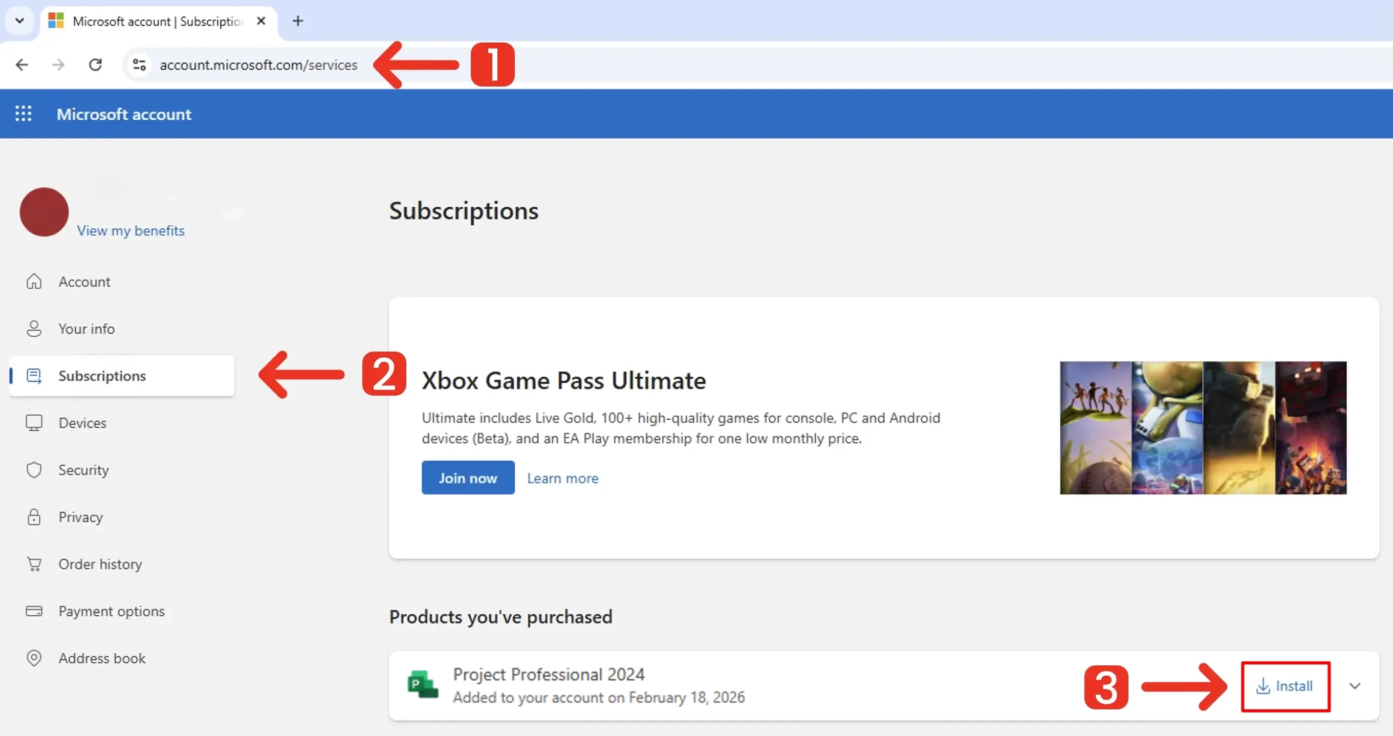 5. Once your product key is redeemed, go to account.microsoft.com/services and click "Install" next to Project.