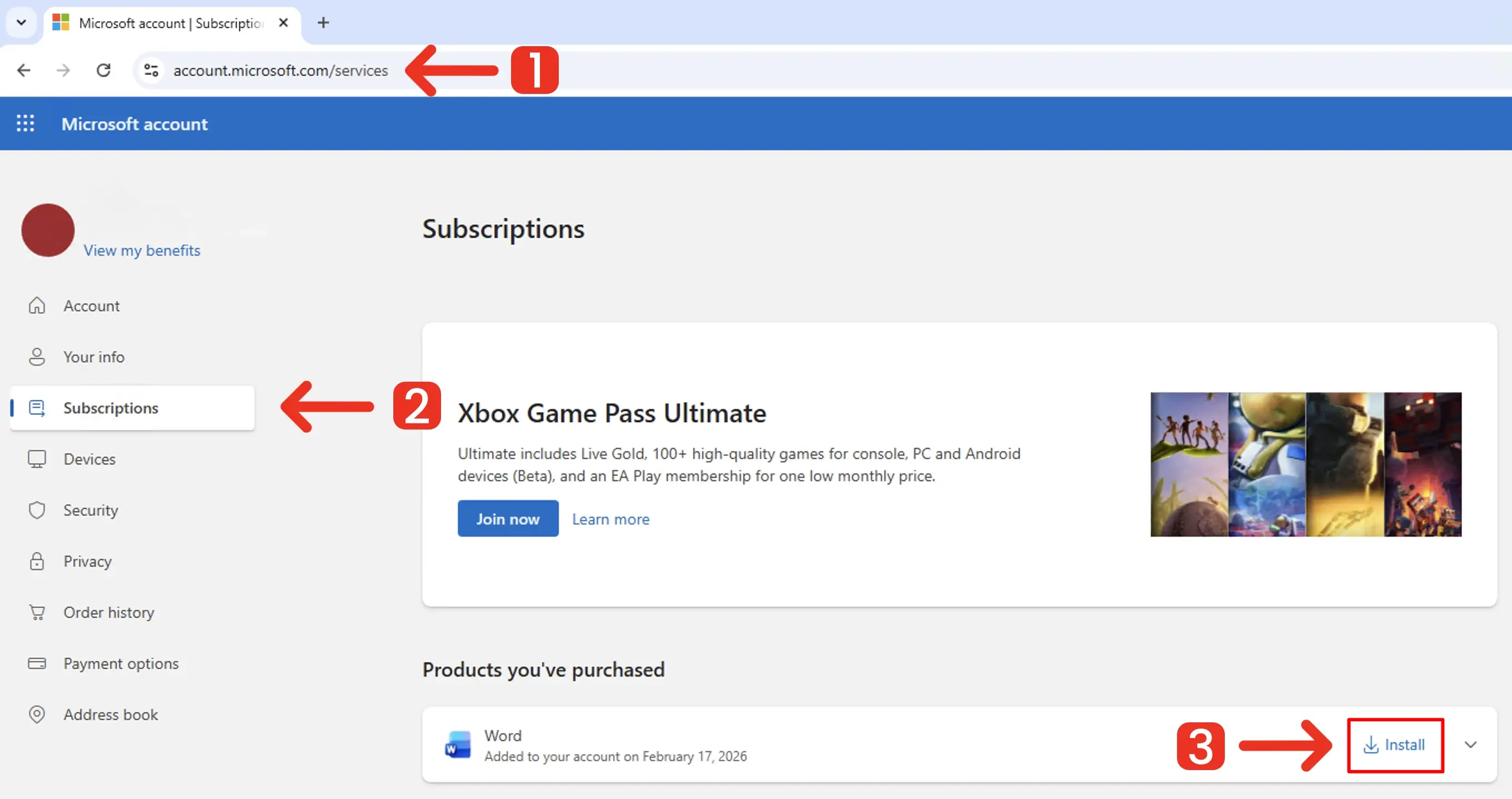 5. Once your product key is redeemed, go to account.microsoft.com/services and click "Install" next to Word.