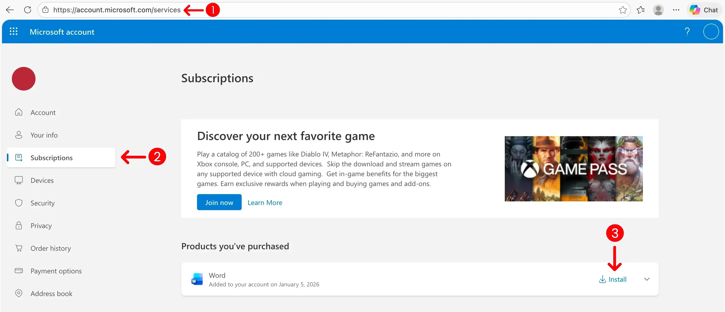 5. Once your product key is redeemed, go to account.microsoft.com/services and click "Install" next to Word.